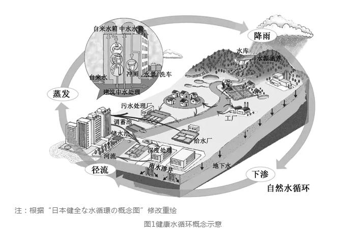 2014年至今,日本城市水系統(tǒng)進(jìn)入了體系優(yōu)化階段,這一階段最顯著的特點是健康水循環(huán)理念得到前所未有的重視,城市水系統(tǒng)工作從要素治理向系統(tǒng)綜合整治轉(zhuǎn)變。事實上,日本很早就開始重視水循環(huán)的重要作用,2000年制定的《全國綜合水資源計劃》(又稱“21世紀(jì)水計劃”)就提出了構(gòu)筑可持續(xù)的用水體系,適應(yīng)循環(huán)型社會發(fā)展的要求,但由于種種原因,這一理念在涉水工作發(fā)展進(jìn)程中并未被完全落實。隨著日本經(jīng)濟(jì)社會發(fā)展模式的轉(zhuǎn)變,人口老齡化和氣候變暖等多種因素的影響,加以城市水資源、水環(huán)境、水安全問題仍舊凸顯,日本的城市規(guī)劃建設(shè)者開始意識到城市水系統(tǒng)是城市復(fù)雜大系統(tǒng)的重要組成部分,涉及城市水資源開發(fā)利用、水環(huán)境治理保護(hù)、水安全保障提升等全要素全過程,局部的涉水工作難以解決整體問題,需要用系統(tǒng)的思維來認(rèn)識和分析面臨的水問題,以城市為核心構(gòu)建健康水循環(huán)才能實現(xiàn)城市水系統(tǒng)對經(jīng)濟(jì)社會的永續(xù)支撐(見圖1)。