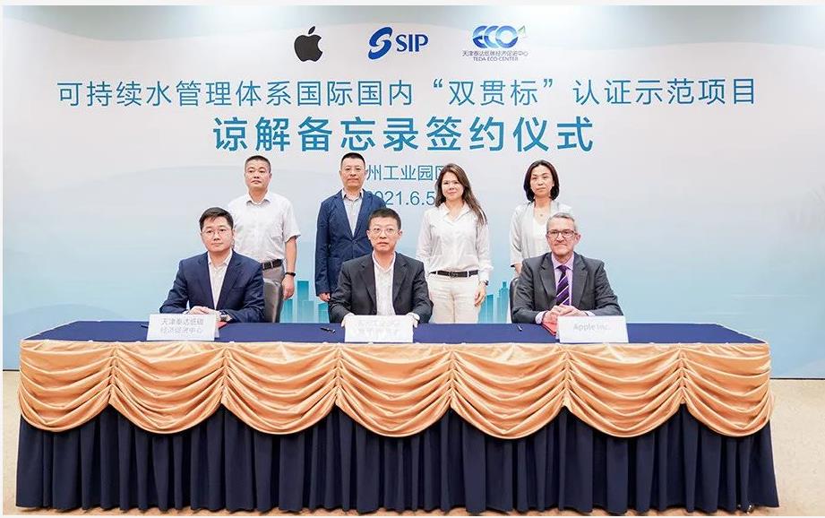 2021年6月5日,蘇州工業園區管理委員會與蘋果公司、天津泰達低碳經濟促進中心簽署諒解備忘錄,共同推動全球首例、國內首個產業園區可持續水管理體系國際國內“雙貫標”認證示范項目在園區落地。